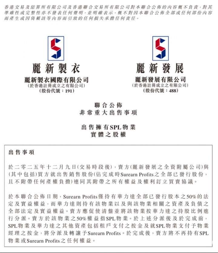 12月9日,香港丽新发布公告称,该公司旗下实际控制的主体TIL出售了其100%持股的SurearnProfitsLimited的股权,上述股权对应的底层资产为位于香港中环的中国建设银行大厦部分办公楼层,面积约1.12万平方米(含公区摊销面积),交易还需获得相关审批。据了解,收购方为京东控股的投资主体。
